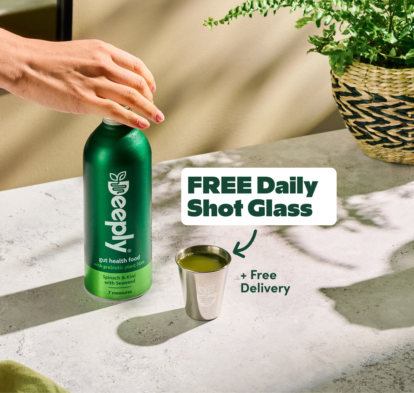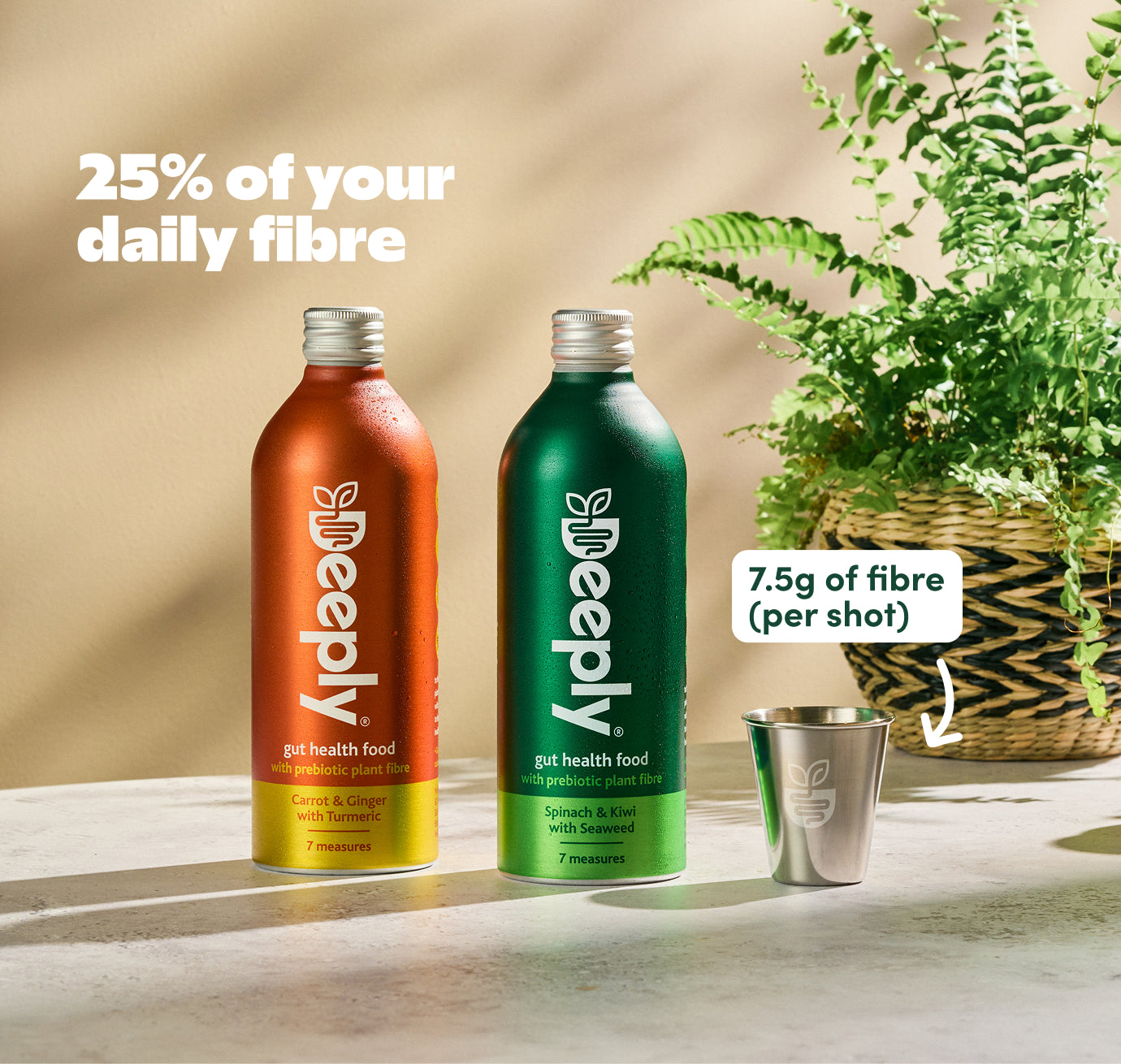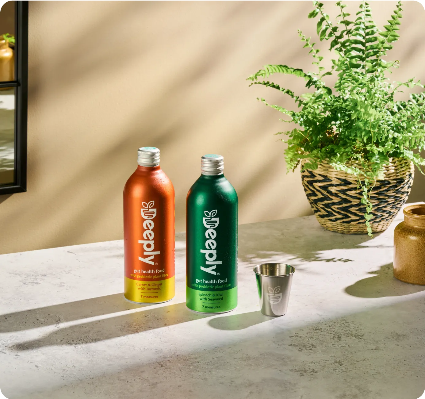 In every first delivery of Deeply we provide you with a stainless steel Deeply cup. It’s 70ml, so filling it just below the lip ensures you are getting your 65ml each day.