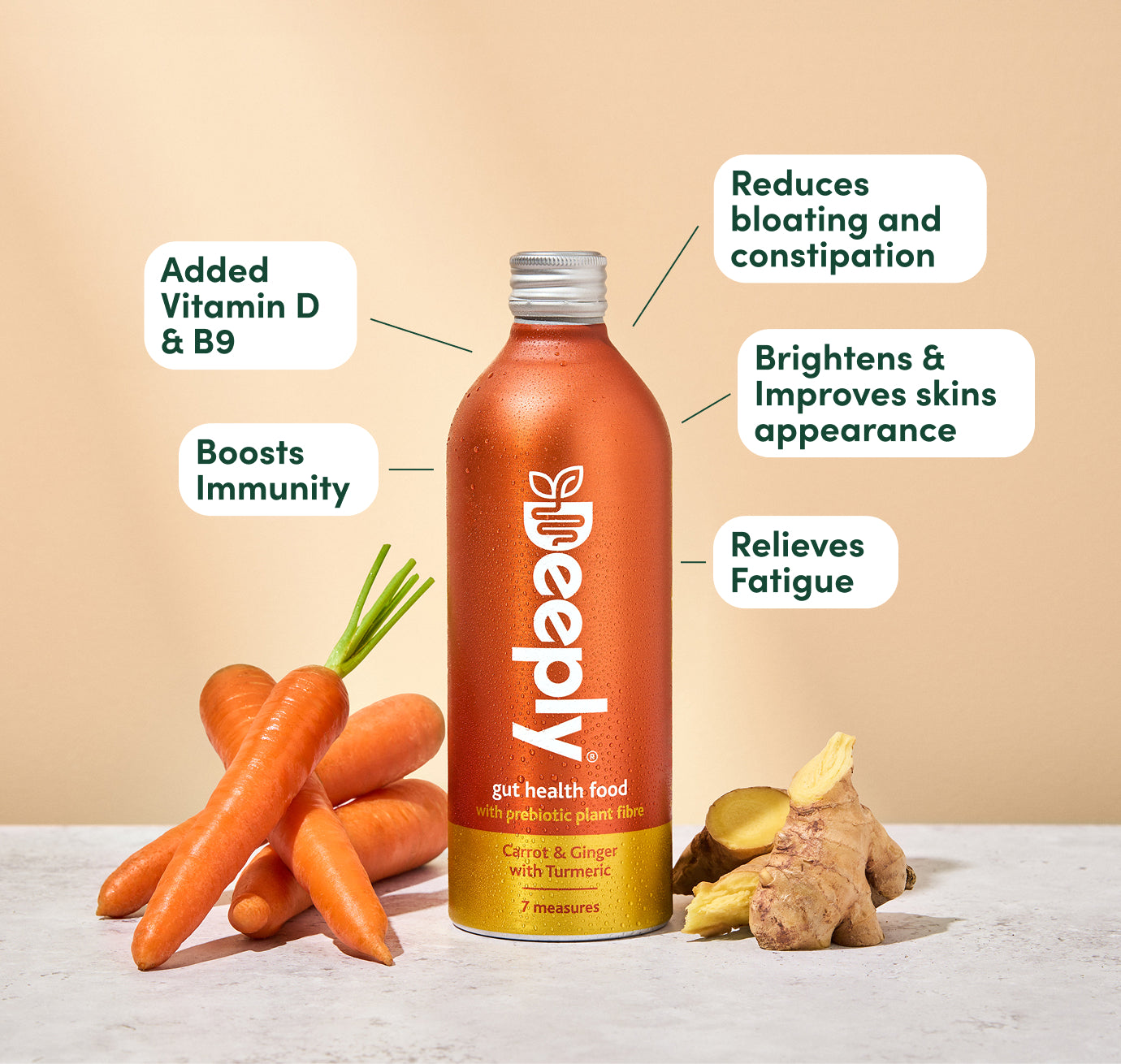 You'll find more prebiotic fibre per serve in Deeply than any gut health shot. Each fibre is selected for the different positive health effects seen in scientific studies. Learn more about our ingredients.